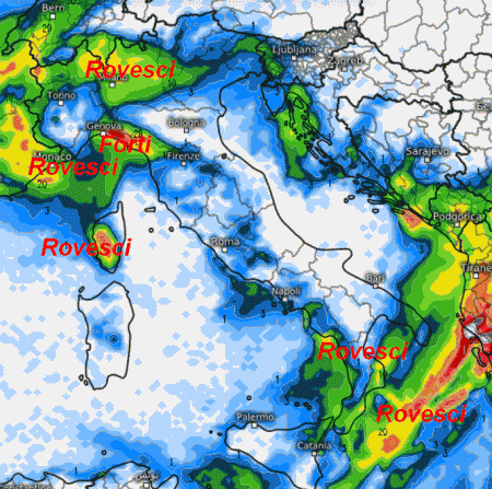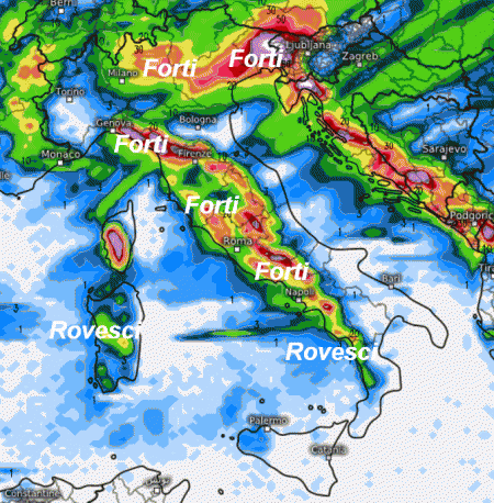 Rovesci forti sul settore alpino e prealpino centro-orientale, la Liguria e tutto il versante tirrenico fino alla Calabria, con cumulate massime nelle aree interne. Rovesci anche sulla Sardegna. Persisteranno venti forti e mareggiate lungo le coste esposte a ponente.