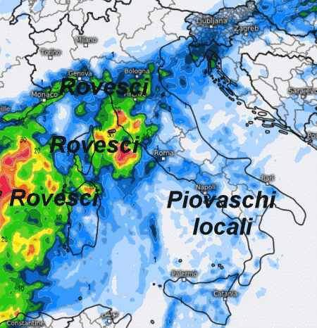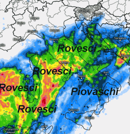 Rovesci su Sardegna settentrionale, Toscana, alto Lazio, Liguria ed Emilia Romagna; piovasci sparsi anche al meridione specie nelle aree interne e sulla Campania. Asciutto invece a nord del Po e sulle Alpi.
