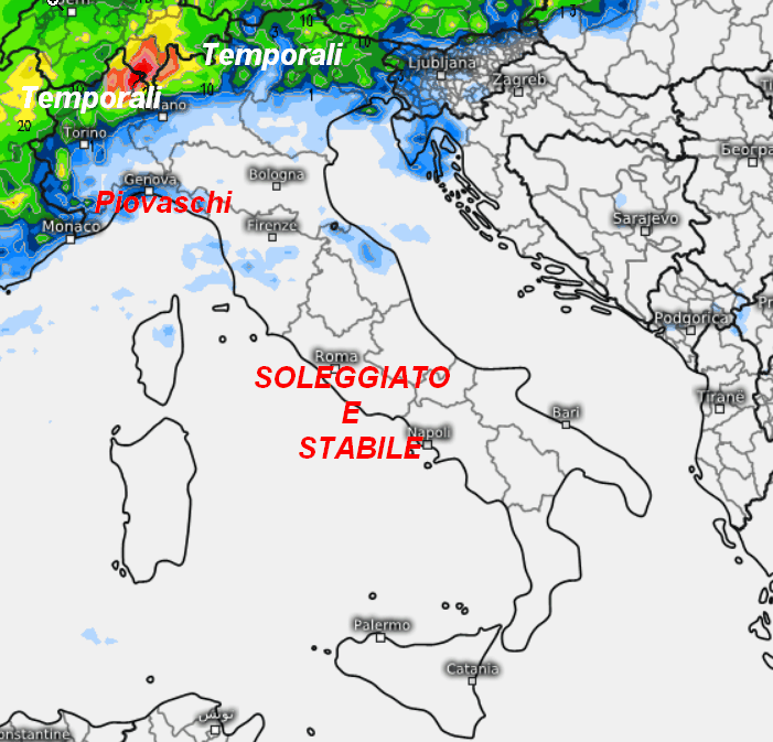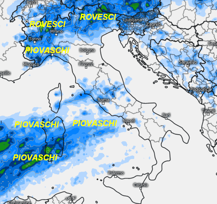 Al nord piovaschi o rovesci al nord-ovest, su Alpi e Prealpi con anche qualche temporale; tempo più asciutto sui restanti settori dell’alta Italia. Piovaschi arriveranno a bagnare in parte la Sardegna, ma in un contesto di variabilità e senza accumuli importanti; qualche piovasco potrebbe raggiungere anche il medio Tirreno, per il resto tempo asciutto, soleggiato e caldo specie al sud.