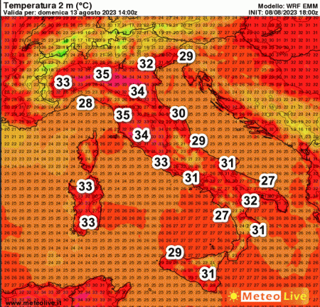 Notiamo come i valori più elevati saranno presenti sulla Pianura Padana, con punte di 34-35°, così come sul medio e alto versante tirrenico. Relativamente più contenuti i valori termici sul resto d’Italia.