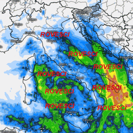 La prima mappa mostra la sommatoria delle precipitazioni attese in Italia nell’arco della giornata di sabato 12 novembre: