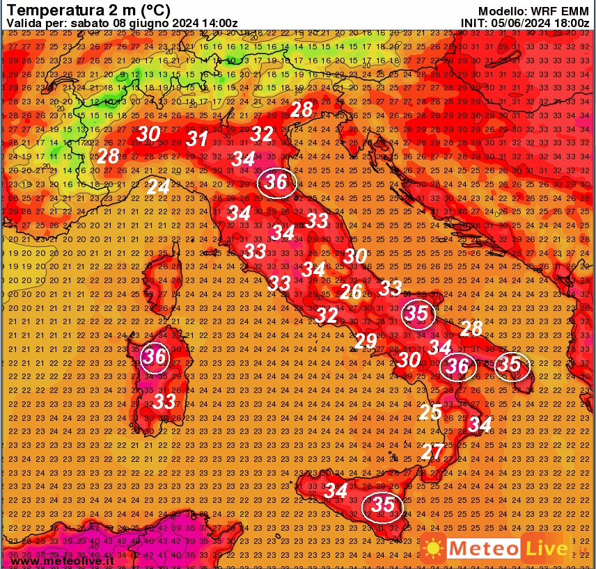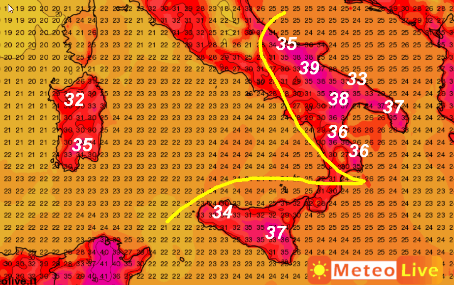 Punte di 37-39° saranno possibili sulla Puglia, la Lucania, il Molise e la Sicilia; 35° saranno presenti sulla Sardegna meridionale, mentre al nord i valori termici caleranno anche sensibilmente con l’arrivo delle piogge e dei temporali.