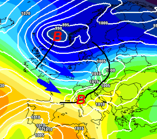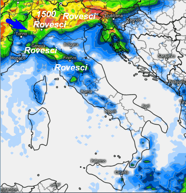 Si nota la perturbazione in azione al nord ed in tendenza anche sulla Toscana. Verrà seguita da aria più fredda nord atlantica anche se il grosso del “freddo” dovrebbe mantenersi oltre l’arco alpino. Da noi arriverà una porzione ridotta di aria fredda che agirà comunque sui nostri termometri con un calo termico ad iniziare dalle regioni del nord.