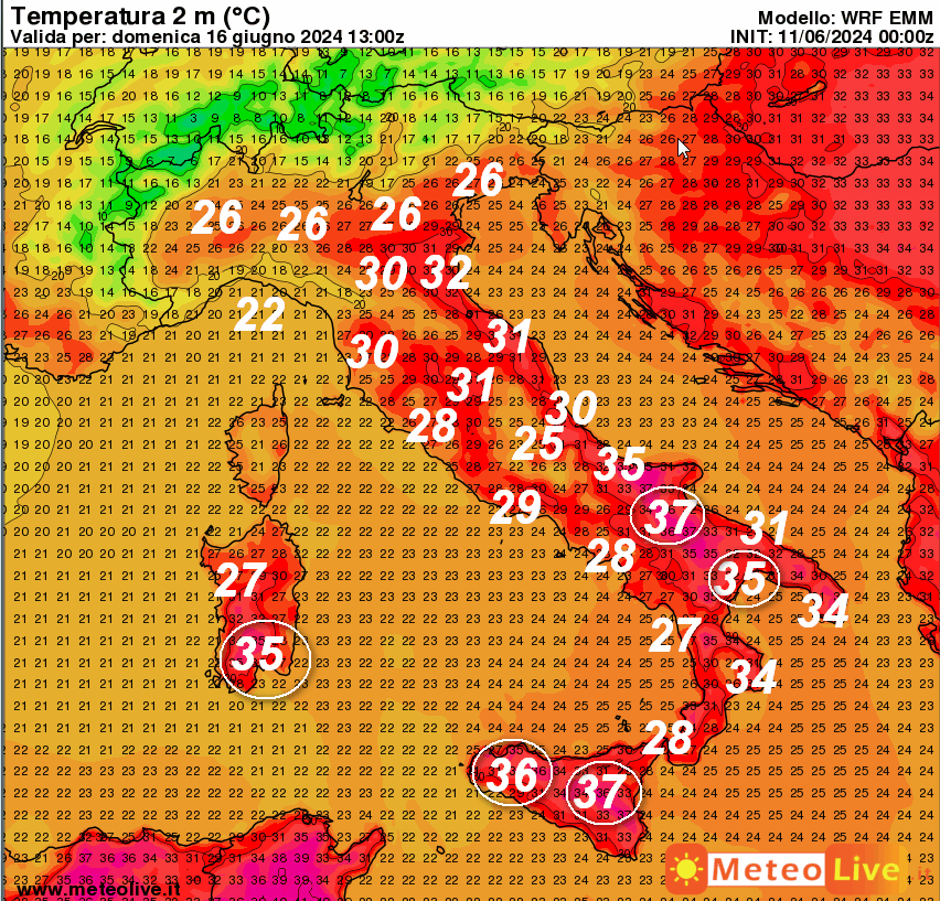 Infine, queste sono le temperature previste al suolo nel pomeriggio di domenica 16 giugno: