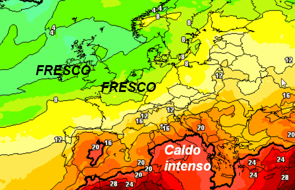Ecco il caldo intenso che interesserà parte delle regioni centrali e soprattutto il meridione, dove avremo isoterme alla medesima quota anche superiori a + 20°. Temperature più gentili invece altrove, senza oltrepassare i + 20° alla medesima quota.