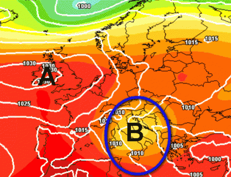 Notate un forte anticiclone in sede inglese che si congiunge con un ponte ad un’altra zona anticiclonica sull’Europa nord-orientale.