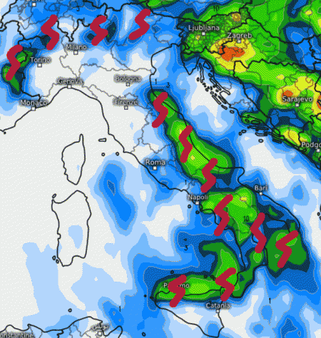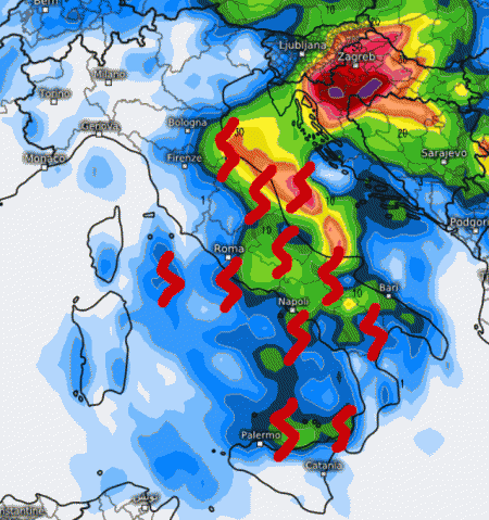 Temporali intensi associati a nubifragi saranno possibili su Marche, Abruzzo, Molise, Campania, Puglia e Lucania. Temporali anche nel nord della Sicilia; meno probabili i fenomeni sulle aree estreme e in Sardegna dove arriveranno solo piovaschi locali.