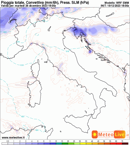 Le mappe sono estrapolate dal nostro modello fisico matematico WRF 10km: mostrano la quantità di pioggia prevista.
