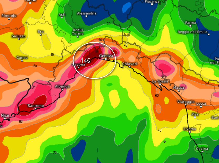 Massima attenzione tra il Savonese di Levante e il Genovese di ponente oltre al rispettivo entroterra, dove il modello in questione prevede accumuli piovosi fino a 146mm.