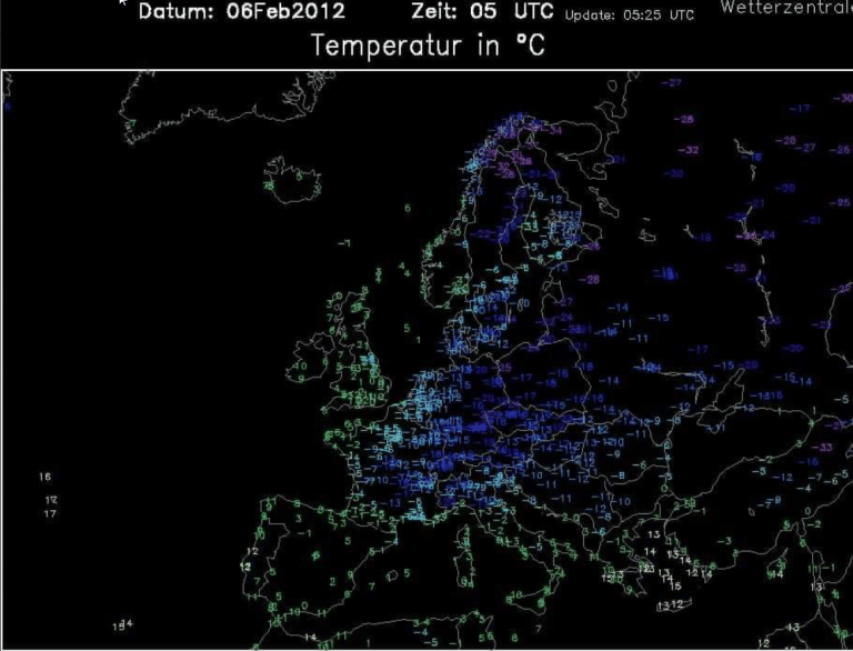 Ecco una mappa delle temperature che erano presenti esattamente 12 anni fa, ovvero il 6 febbraio 2012. Inutile rimarcare che la situazione era ben diversa rispetto ad ora. Si consiglia di ingrandire l’immagine per avere un migliore riscontro visivo.