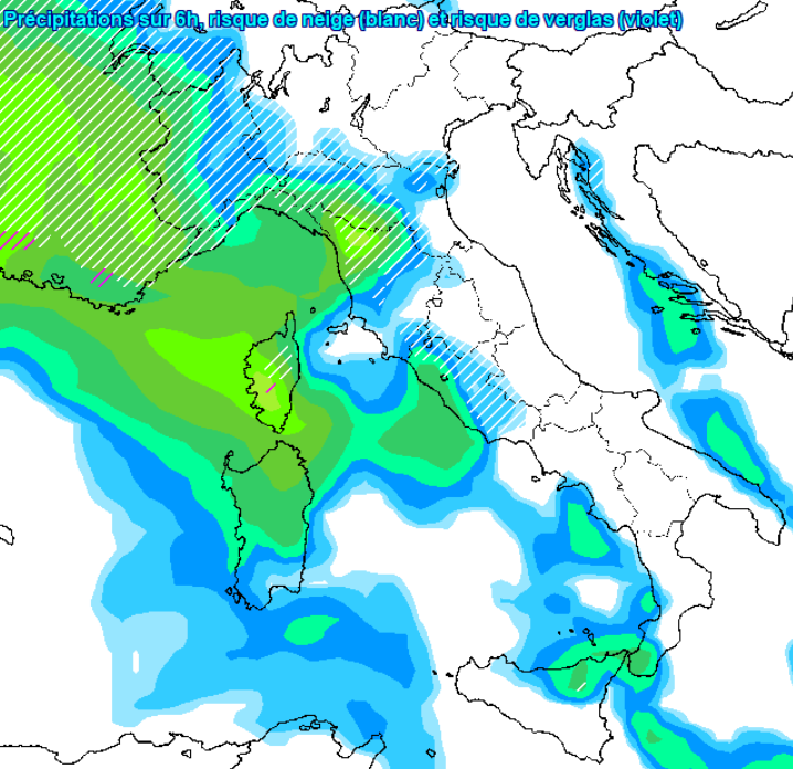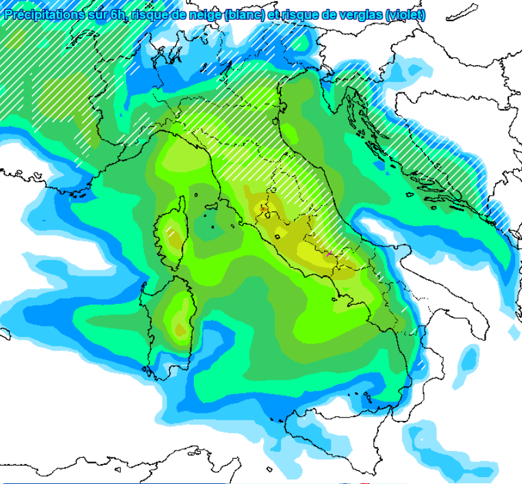 Nelle ore successive la neve conquisterebbe l’Emilia-Romagna e le zone interne del centro, come si vede qui sotto: