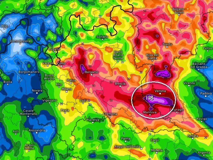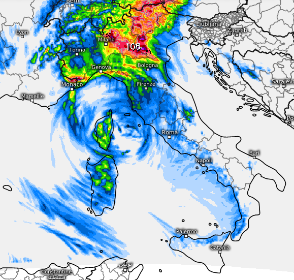 Un ultimo sguardo d’insieme per capire anche dove andrà a collocarsi il vortice responsabile delle precipitazioni al largo della Corsica e il picco di 108mm tra il Veronese e il Mantovano: