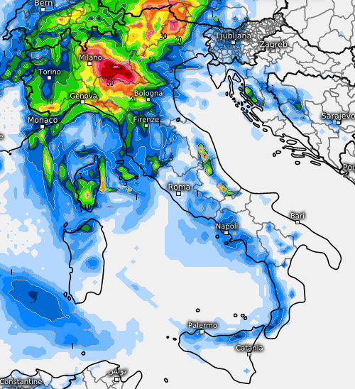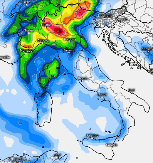 Discreti o buoni gli accumuli anche sull’Emilia, il basso Piemonte, abbondanti sul Trentino-Alto Adige e l’alto Cadore, la Liguria interna, più modesti su Toscana, Sardegna e in genere le regioni tirreniche, qui un altro modello, sempre con la sommatoria dei fenomeni prevista sino a giovedì 11: