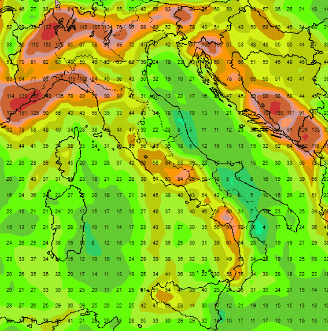 Si consiglia di ingrandire le immagini per avere un migliore riscontro visivo. I due modelli sono abbastanza allineati e mostrano i massimi di pioggia sulla fascia prealpina, sulla Liguria e sul medio-basso Tirreno.