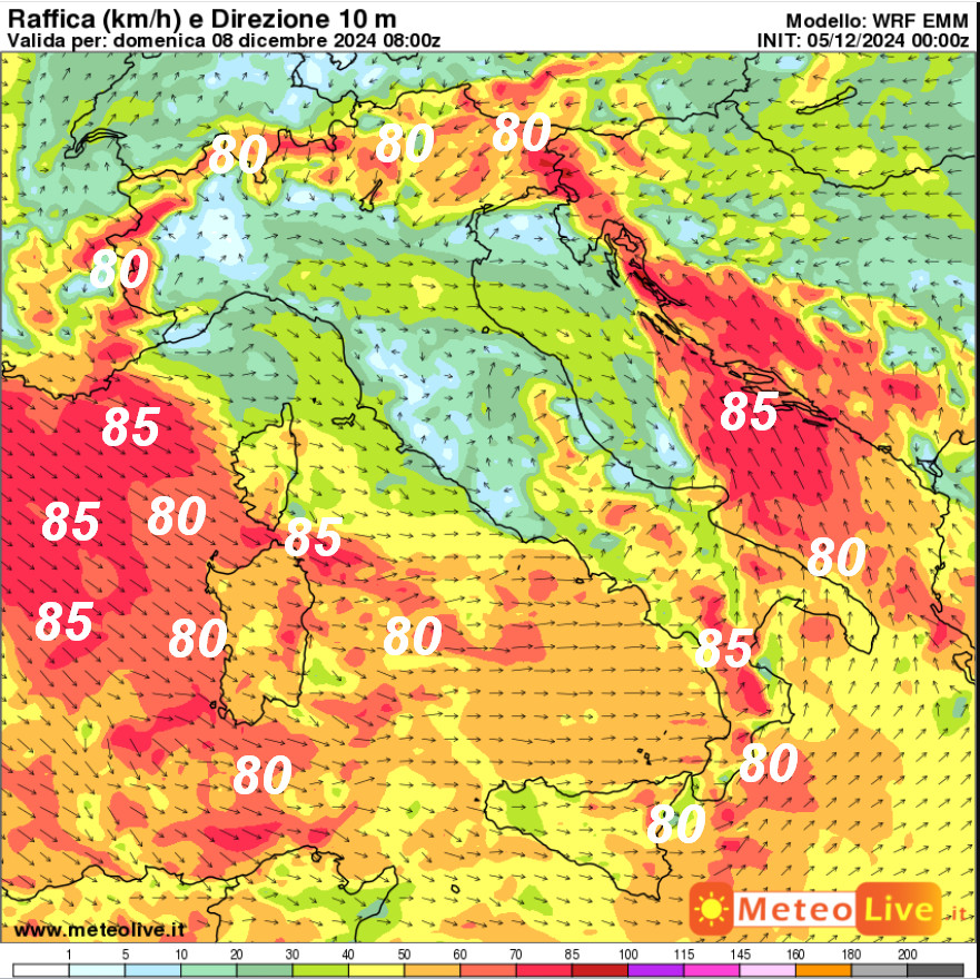 I numeri rappresentano le velocità in Km/h. Punte di 80-85km/h saranno possibili nei pressi della Sardegna e al meridione. Vento molto forte anche sui valichi alpini fino a 80km/h. Questa previsione è però suscettibile di cambiamenti, continuate a seguirci.