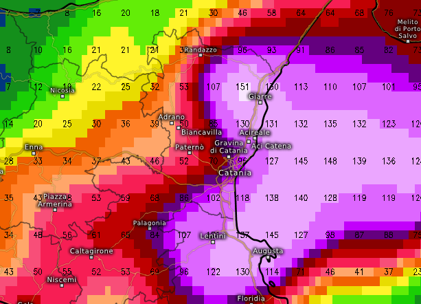 E’ vero che i fenomeni più abbondanti si registreranno in mare aperto sullo Jonio, ma comunque colpiranno anche l‘immediato entroterra e la linea di costa tra Giarre, Acireale, Aci Catena, Gravina di Catania, Catania, Lentini, Augusta e Floridia, dove si attendono mediamente tra i 100 e i 151mm di pioggia in meno di 6 ore, una quantità che potrebbe determinare alluvioni lampo per l’esondazione di fiumare, non in grado di contenere tutta quella pioggia.