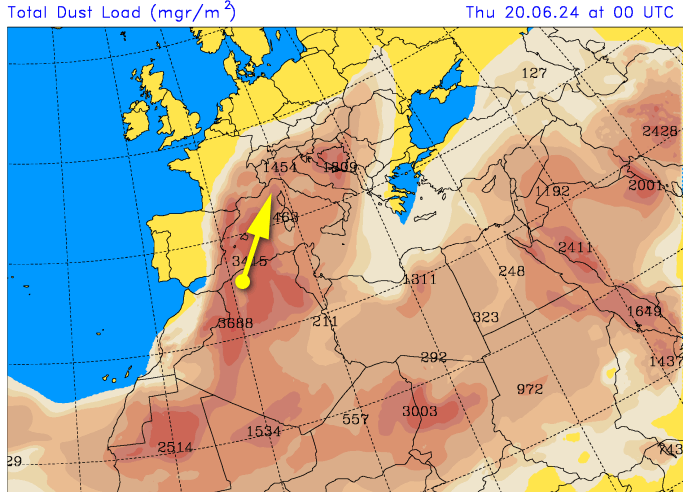 Tra oggi e domani avremo probabilmente la massima concentrazione di sabbia sui nostri cieli. Qualora dovesse piovere, le piogge saranno marroni per via delle alte concentrazioni di pulviscolo.