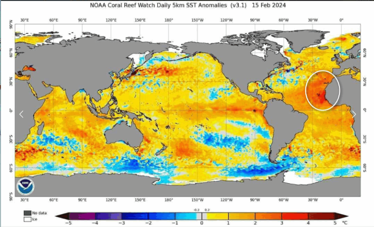 La mappa chiarisce molto bene il problema che sta affliggendo l’Europa centro-occidentale e l’Italia in questo periodo. Notata le anomalie oceaniche al rialzo nell’area cerchiata, ovvero la zona da dove sono partite (e partono) le peggiori rimonte anticicloniche che hanno distrutto il nostro inverno. Le acque dell’oceano Atlantico in quel punto sono addirittura più calde rispetto alla zona interessata dal fenomeno del NINO. Tutto ciò fornisce energia ad anticicloni di eccezionale potenza che prelevano aria calda direttamente dal tropico e la veicolano verso il nostro Continente. Tutto ciò è messo in rapporto con il rallentamento dell’AMOC che si ripercuote a sua volta sulla ben più nota Corrente del Golfo. In altre parole, tutto il calore invece di essere immesso nel nord Atlantico, tende a concentrarsi in quel punto, favorendo anomalie termiche spaventose. Non è sicuramente un buon viatico avere simili anomalie già a febbraio, in vista dell’estate.