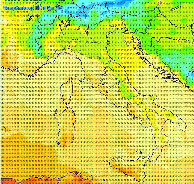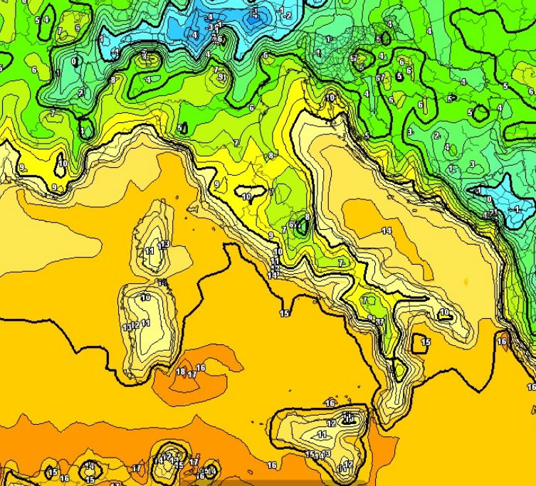 Le conseguenze al suolo sul catino padano e in genere nei fondovalle dell’arco alpino centro-orientale risulteranno meno marcate, poiché sarà presente la classica inversione termica. Temperature invece molto miti in genere sulle isole e lungo le coste del centro e del sud. Da notare i soli 4°C attesi in Valpadana, nel Milanese, evidentemente interessato da strati nebbiosi.