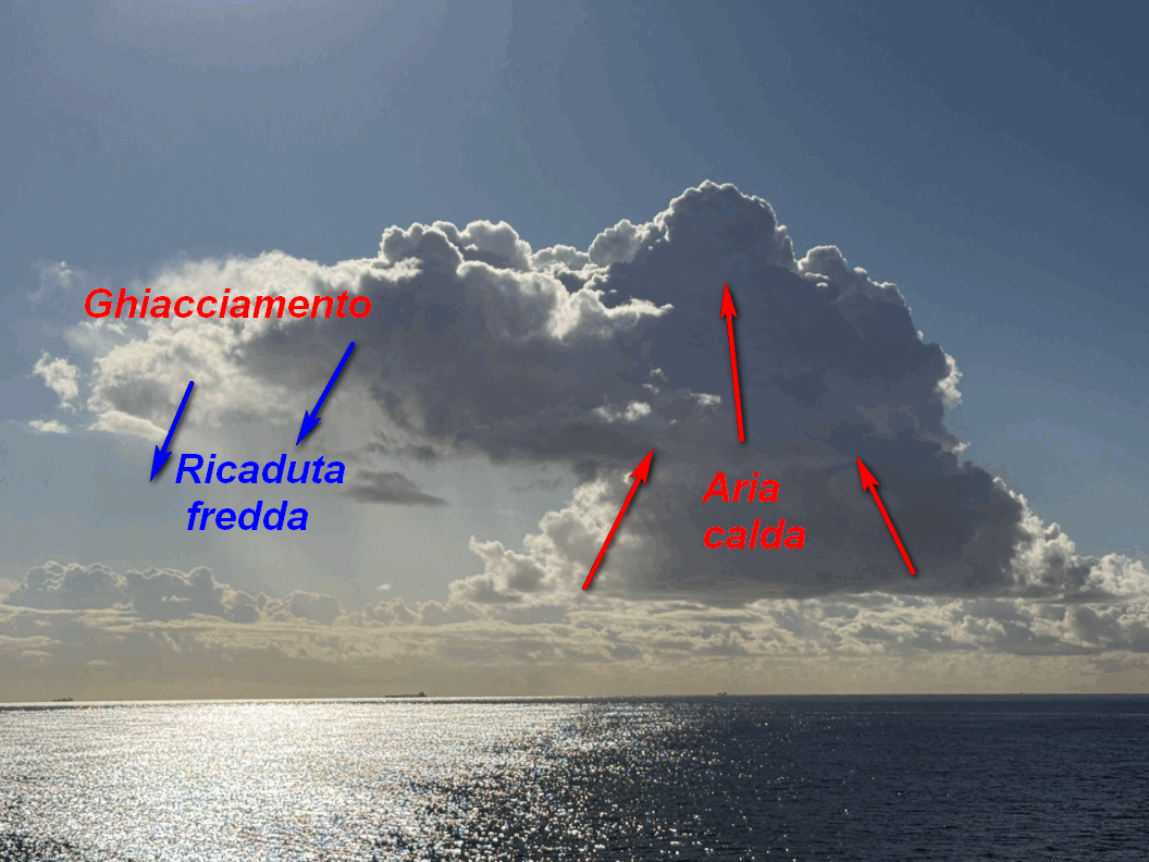 In breve: ecco come l’atmosfera cerca di ridurre lo scarto termico tra la superficie marina (+23) e la quota (-20° a 5000 metri). L’aria calda è più leggera, si solleva, si condensa e da origine a nubi a sviluppo verticale (cumuli e cumulonembi). Il processo di condensazione è ESOTERMICO, quindi libera altro calore che implementa la salita dell’addensamento nuvoloso verso l’alto. Arrivato in quota, si trova immerso in temperature freddissime (fino a -20 a 5000 metri). Le goccioline delle nube, pertanto, non riescono a mantenersi liquide e ghiacciano (parte sinistra del cumulo). I cristalli di ghiaccio collidono tra di loro e danno origine a fiocchi di neve o chicchi di grandine (questi ultimi si formano se la corrente ascendente è molto intensa). Nel loro moto verso il basso tendono a fondere in gocce di pioggia e si ha quindi una precipitazione piovosa a livello del suolo. L’aria calda che sale (al centro del cumulo) viene quindi compensata dalla ricaduta fredda nella zona periferica del cumulo medesimo ed il loop è completato. La presenza di ghiaccio ed acqua nella nube tende a separare le cariche elettriche: le positive migrano nella parte ghiacciata e le negative nella parte liquida. Quando la differenza di potenziale (la tensione) tra le due parti supera un certo valore, l’aria diventa conduttrice di corrente e parte la scarica elettrica per riequilibrare l’eccessivo divario di tensione tra le parti (il fulmine). Alzate gli occhi al cielo ed osservate questo processo che oggi sarà visibile in molte zone del nord e del centro Italia. La foto è del bravissimo Andrea Ferrando.