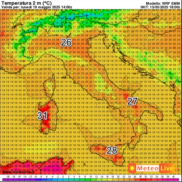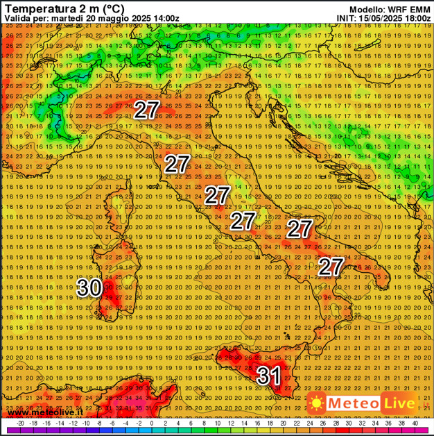 31° nelle aree interne della Sicilia, 30° in Sardegna, 27-28° nelle aree interne del centro-sud e su alcuni settori della Pianura Padana. Altrove temperature complessivamente gradevoli.