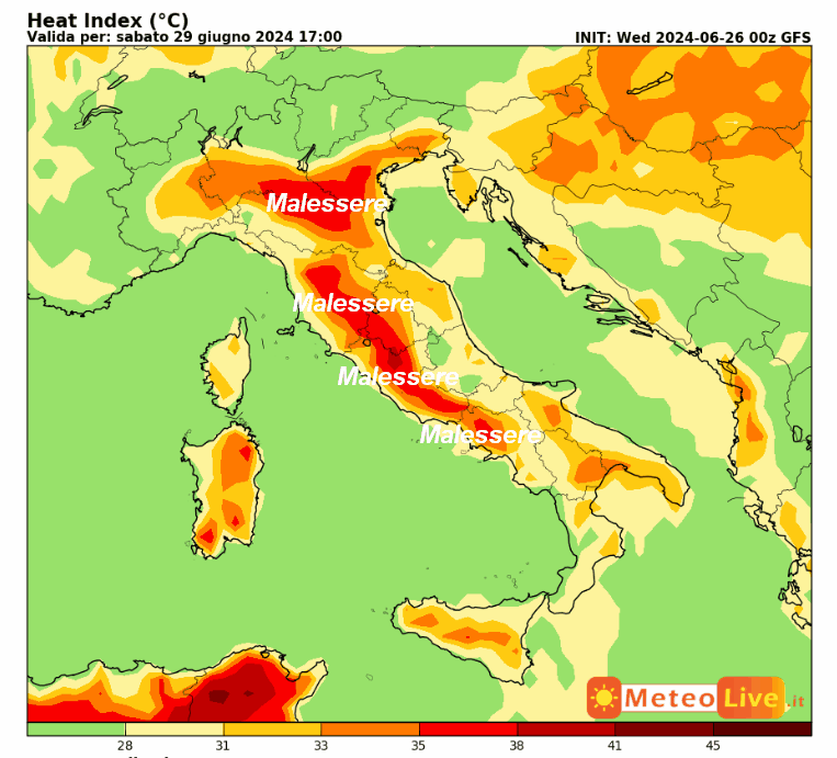 Questo è l’indice DISAGIO da CALDO previsto in Italia alle ore 17 di sabato 29 giugno, peraltro molto simile a quello previsto per venerdì: