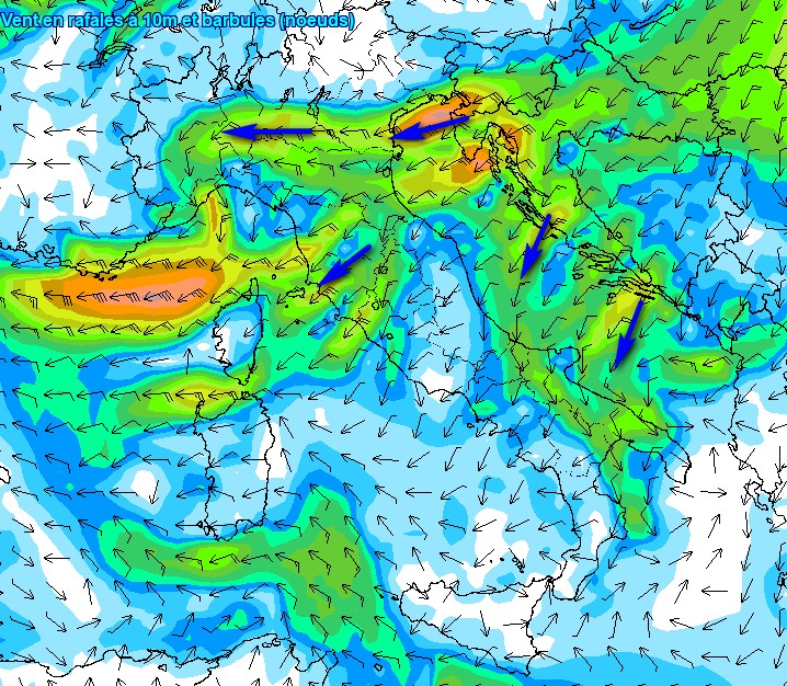 Guardate che vento nella mattinata di giovedì 30 aprile con raffiche oltre i 70kmh nel Golfo di Trieste ma anche “in uscita” sulla Toscana. Ci sarà vento da est sostenuto anche su gran parte della Valpadana, lungo l’Adriatico e la dorsale appenninica e fino giù in Puglia.