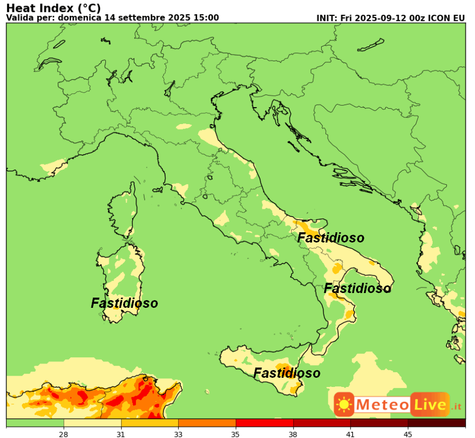 Questo è il DISAGIO da CALDO atteso in Italia alle ore 15 di domenica 14 settembre: