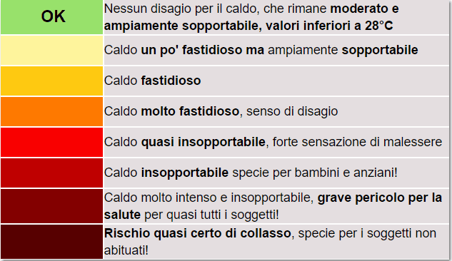 Ricordiamo che il caldo risulta insopportabile quando alle alte temperature si affiancano alti tassi di umidità, con l’inevitabile impennata dell’INDICE di CALORE. Le nostre MAPPE del DISAGIO da CALDO misurano proprio questo parametro ed a seconda di come si presenta, decretano se il caldo è sopportabile, fastidioso o opprimente secondo questa scala cromatica: