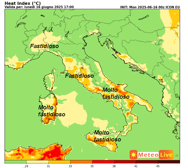 CALDO MOLTO FASTIDIOSO sulla Sardegna, la Sicilia e le aree interne del meridione. CALDO FASTIDIOSO sull’alto e medio Tirreno e al nord-ovest, più SOPPORTABILE altrove.