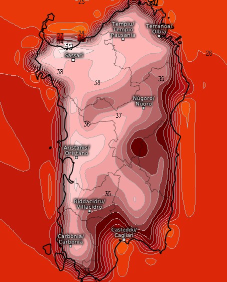 Il grande caldo tornerà all’assalto di alcune regioni nelle giornate di domenica 7, lunedì 8 e martedì 9 settembre. Lo farà soprattutto sulle Isole Maggiori e sulla Puglia, tutte aree che potrebbero raggiungere e localmente superare i 35°C. Qui sotto una mappa termica della Sardegna prevista per le ore centrali di lunedì 8 settembre, notate i picchi di 38°C nel nord dell’isola con un valore di punta di ben 39°C a Sassari, ma farà caldissimo anche ad Oristano, Carbonia, Iglesias, Alghero: