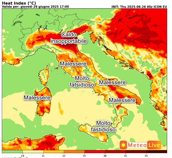 Condizioni di CALDO INSOPPORTABILE sulla Pianura Padana orientale. MALESSERE FISICO sulla Sardegna, la Toscana, l’Umbria, la Puglia e la Lucania. Caldo FASTIDIOSO o MOLTO FASTIDIOSO sul resto d’Italia tranne ovviamente le aree montuose e limitati settori della costa ligure e del basso Tirreno che avranno un caldo maggiormente sopportabile.