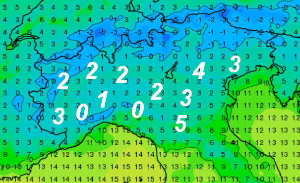 Nelle ore centrali della giornata di domani, mercoledi 17 gennaio, si prevedono temperature molto basse sulle pianure del nord, specie al nord-ovest con valori di poco sopra lo zero. Nella mappa, le temperature attese domani pomeriggio al settentrione alle ore 14