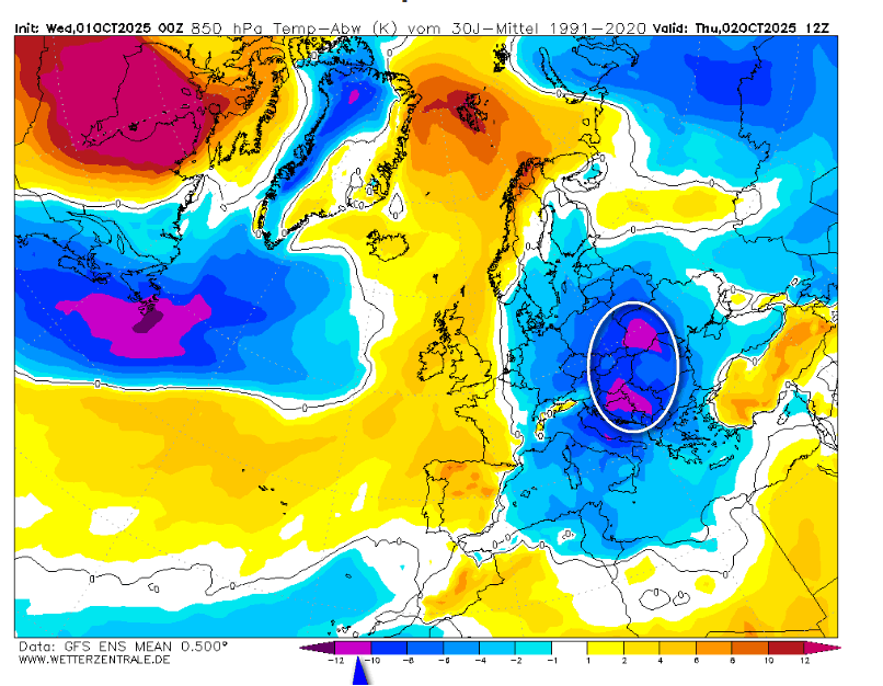 Con il colore fucsia sono identificate anomalie termiche al ribasso tra 10 e 12° . Nelle ore centrali di giovedì 2 ottobre saranno presenti sulla Penisola Balcanica e tra la Polonia e l’Ucraina. Per ciò che concerne l’Italia, si andrà fino a 8° sotto media lungo il versante adriatico con una punta di 10° sotto media in Abruzzo.