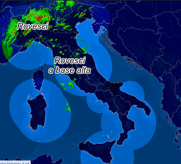 Questa la RIFLETTIVITA’ del RADAR delle ultime 2 ore. Oltre all’alto Piemonte e l’alta Lombardia, sono comparsi rovesci intensi sulla Liguria occidentale (zona Valle Bormida). Rovesci a base alta hanno raggiunto anche parte delle regioni centrali, mentre altrove fa un gran caldo.