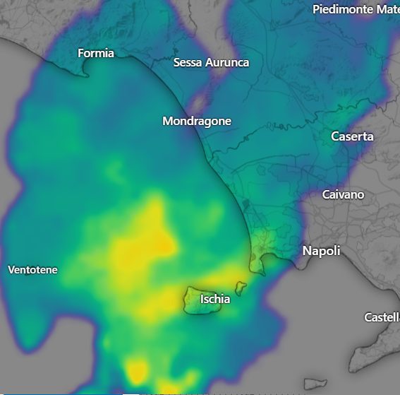 Infine un’altra zona colpita è quella di Ischia, con i temporali che puntano Napoli, che verrà colpita soprattutto tra le 12.30 e le 14, scaricando almeno 10-15mm di pioggia:
