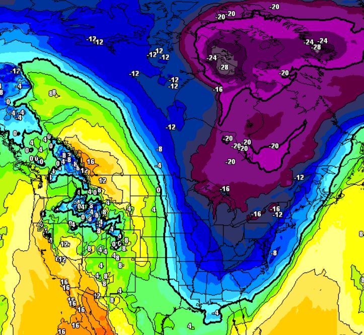 Notate le temperature previste a 1500m per la notte su venerdì 13 secondo il modello GFS sugli States orientali, punte sino a -20°C: