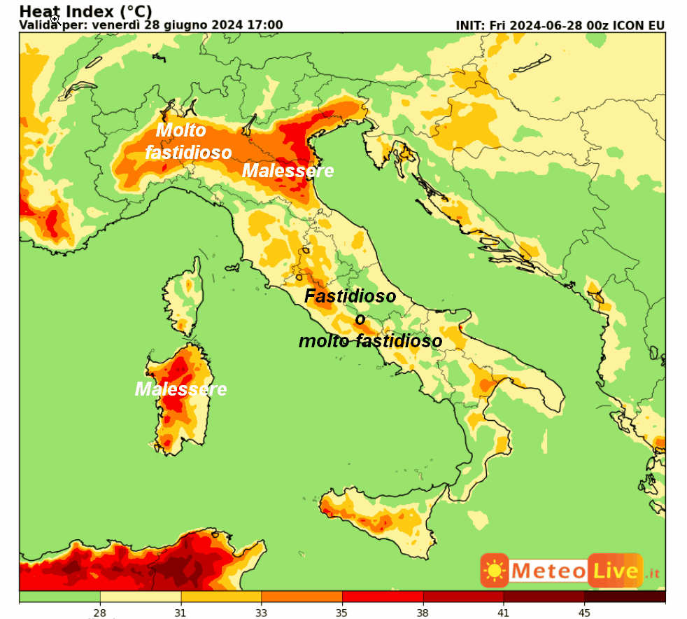 Questa è la mappa del DISAGIO DA CALDO prevista in Italia alle ore 17 della giornata odierna, venerdi 28 giugno: