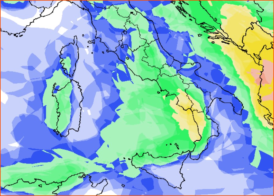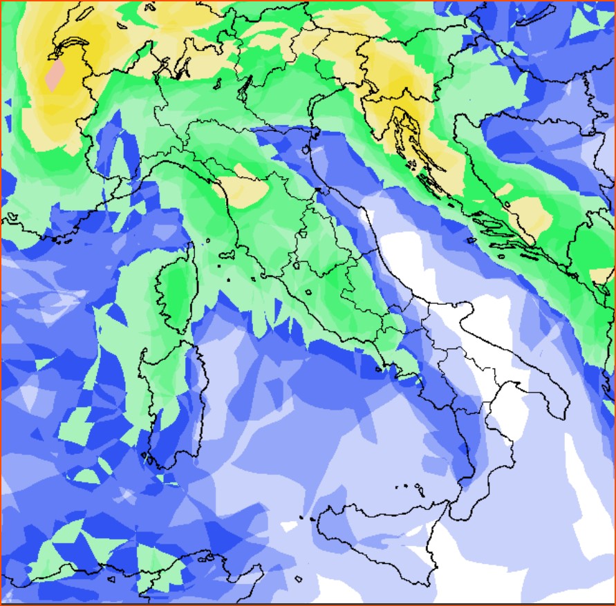 Le piogge successivamente arriveranno anche su gran parte del sud, principalmente sui versanti Tirrenici perchè più esposti alle correnti da ovest-nord-ovest, come evidenziato da questa mappa, sempre dello stesso modello e valida per il 26-27 febbraio, dove le precipitazioni risulterebbero piuttosto probabili fra Campania e Calabria Tirreniche:
