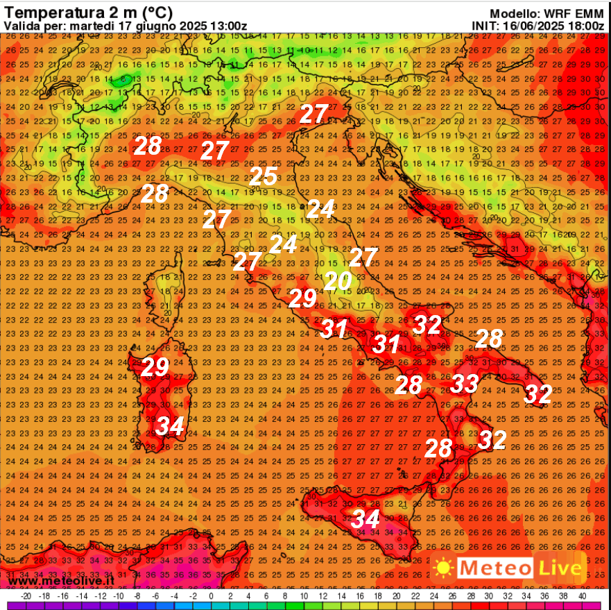 Ecco le TEMPERATURE attese in Italia alle ore 15 di martedi 17 giugno