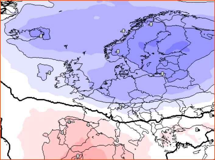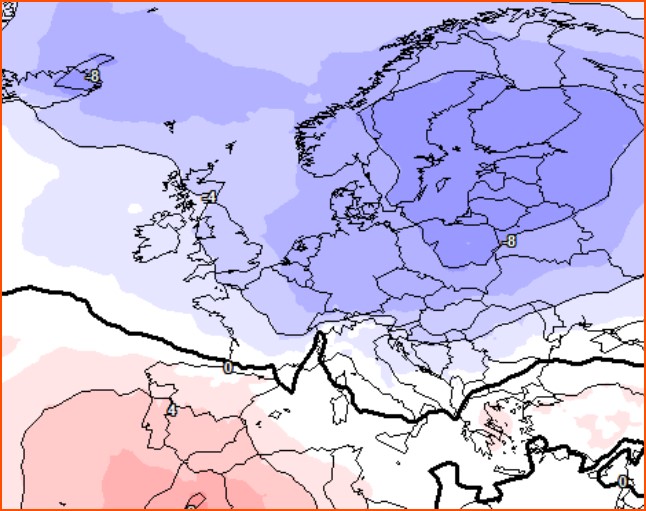 Questo infatti è la media degli scenari del modello ECMWF che indica l’anomalia termica a 1.500m (in azzurro i valori inferiori al normale):