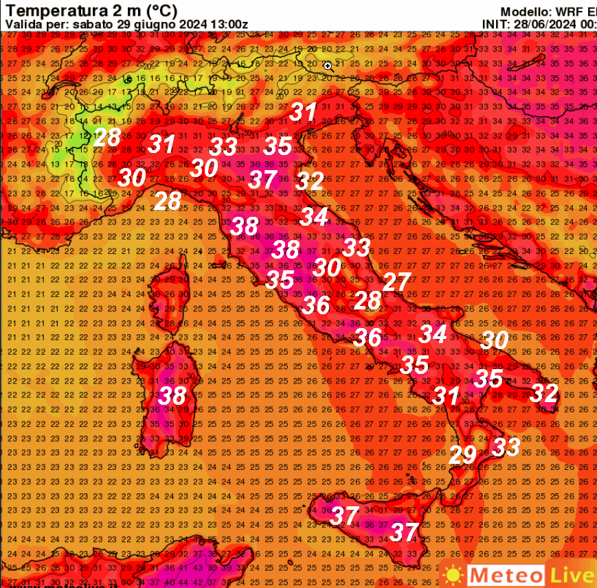 Non solo temporali al nord, ma anche tanto caldo in Italia; saranno questi gli ingredienti del prossimo fine settimana. La prima mappa mostra le temperature attese in Italia alle ore 15 della giornata di sabato 29 giugno: