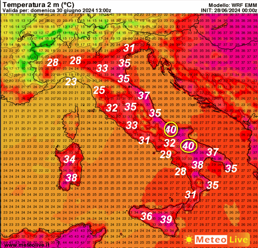 Queste invece sono le temperature attese in Italia alle ore 15 di domenica 30 giugno:
