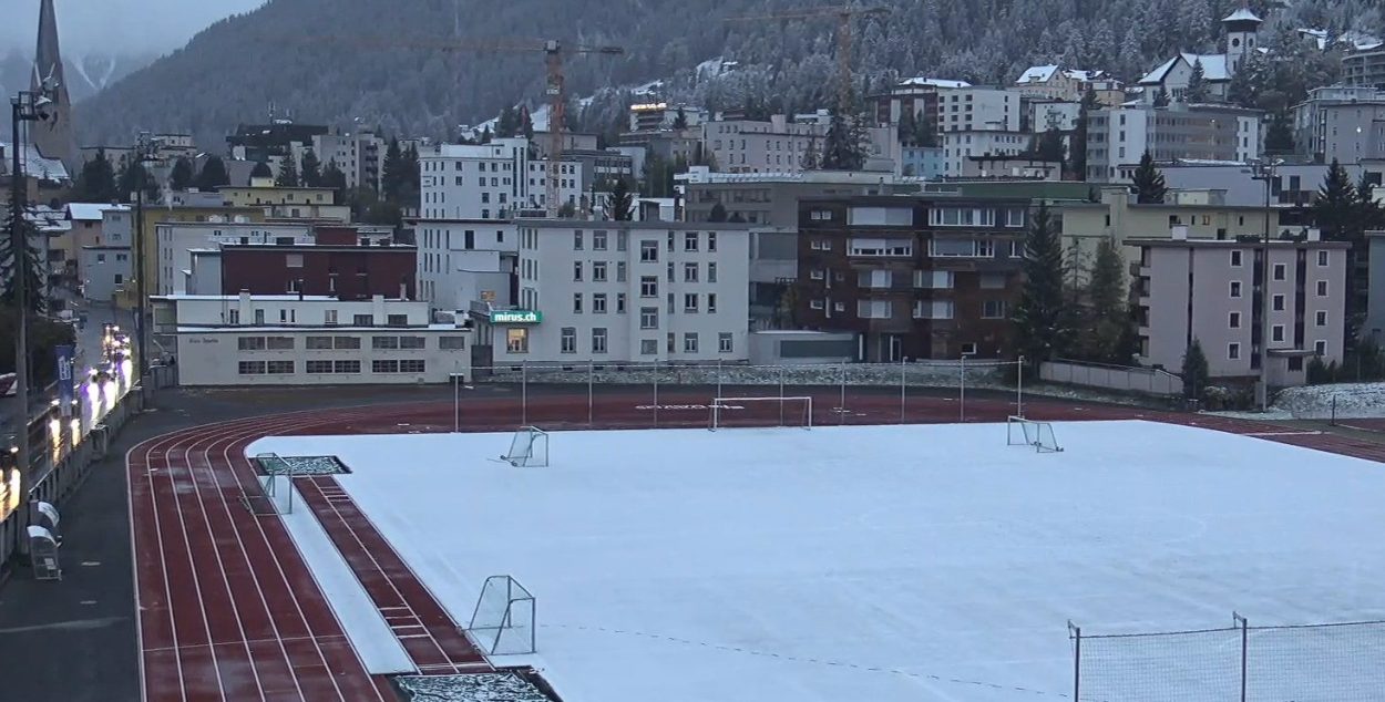 Leggermente più copiosa ma bagnata la nevicata nella Svizzera interna, qui siamo a Davos, dove il campo di calcio appare ben imbiancato: