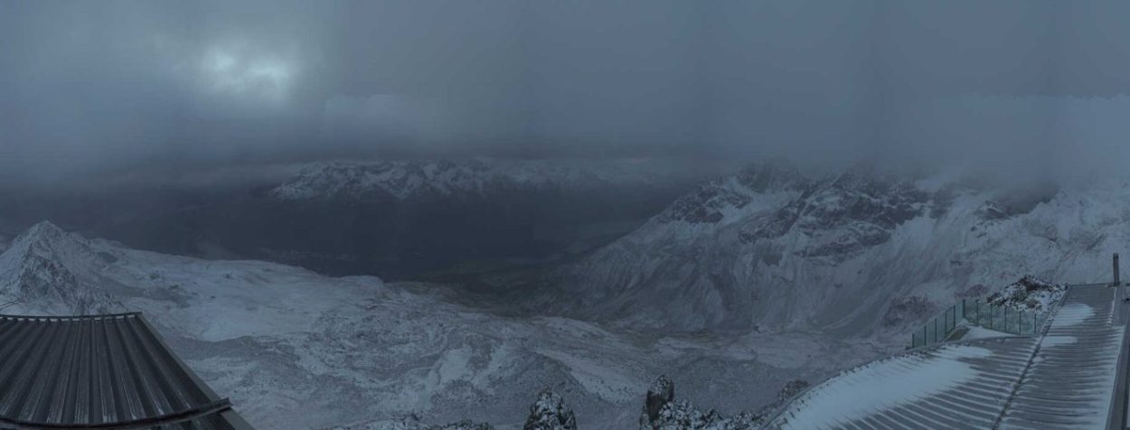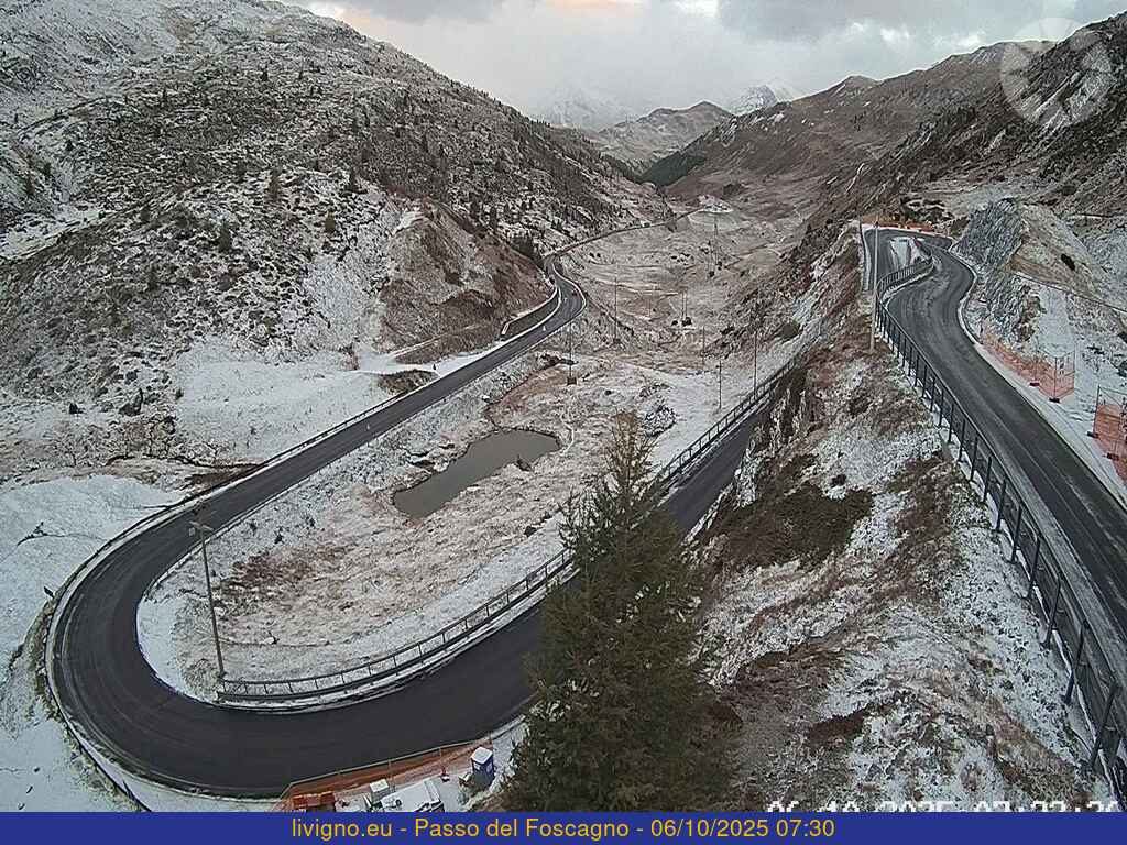 Qualche fiocco anche a Livigno e a St.Moritz. Appena asperso di bianco il passo del Foscagno, tra Bormio e Livigno: