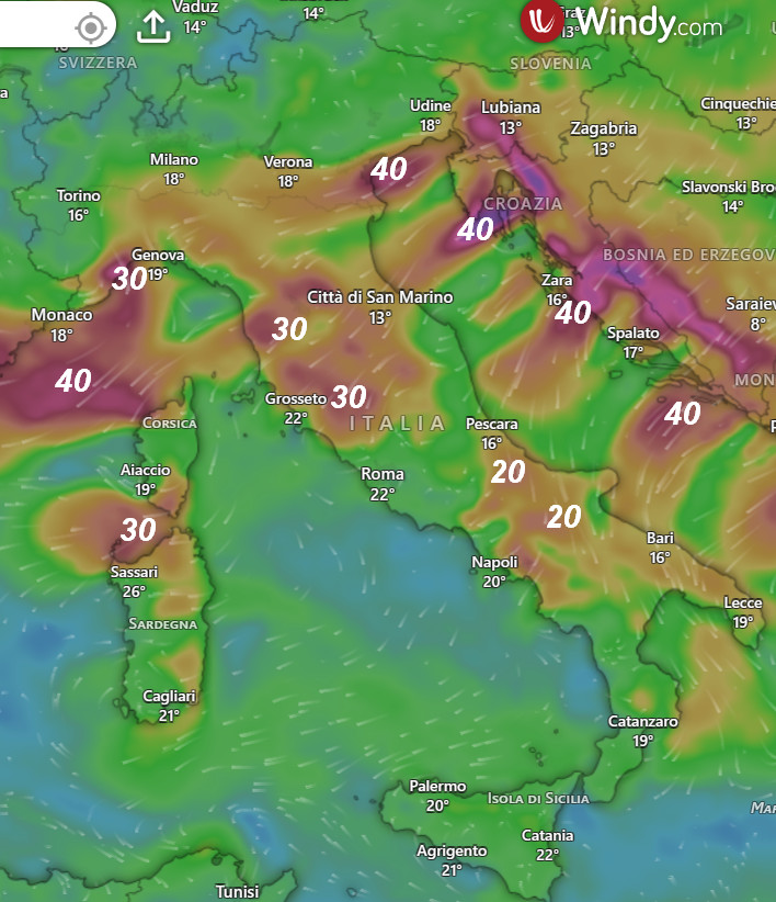E’ una giornata ventosa su diverse aree della Penisola; in alcune zone le raffiche superano i 30-40 nodi: