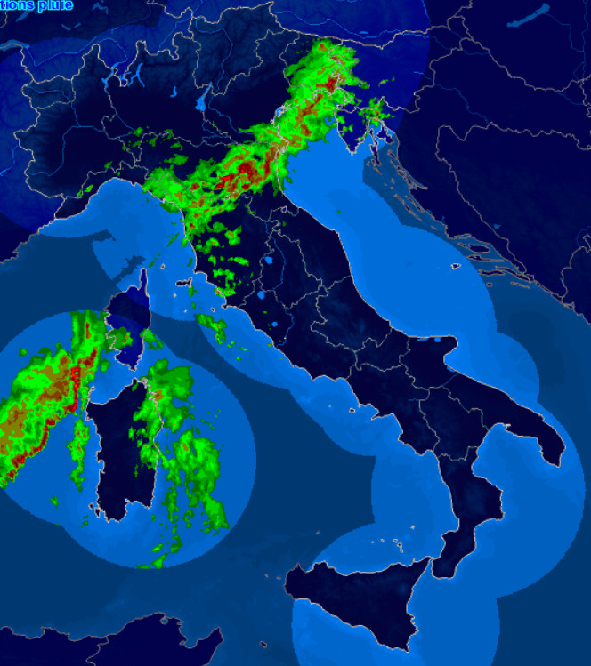Rovesci intensi tra Liguria orientale, Emilia Romagna, basso Veneto e Friuli. Rovesci in atto anche su Toscana e Sardegna. Sul resto d’Italia tempo asciutto.