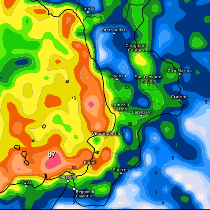 Forti temporali provenienti dal mare Tirreno si abbatteranno principalmente lungo le coste soprattutto fra la provincia di Cosenza e quella di Reggio Calabria, fra domenica e martedì mattina, come evidenziato da queata mappa ad alta risoluzione: