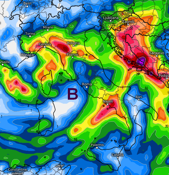 Ed ecco le conseguenze sul piano precipitativo sempre dello stesso modello GFS, dove si nota l’invorticamento delle precipitazioni intorno al minimo presente sul medio Tirreno, con fenomeni in risalita da sud verso nord e neve in arrivo sulle Alpi e sul nord Appennino, addirittura locali nubifragi (es. Campania):