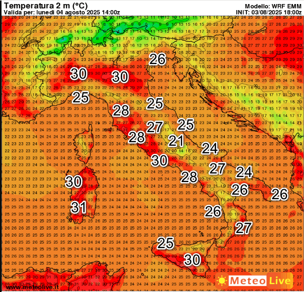 Condizioni di benessere fisico indotto dalle correnti settentrionali praticamente ovunque. Punte di 31° sulla Sardegna, 30° in Sicilia e sulla pianure dell’Italia settentrionale.